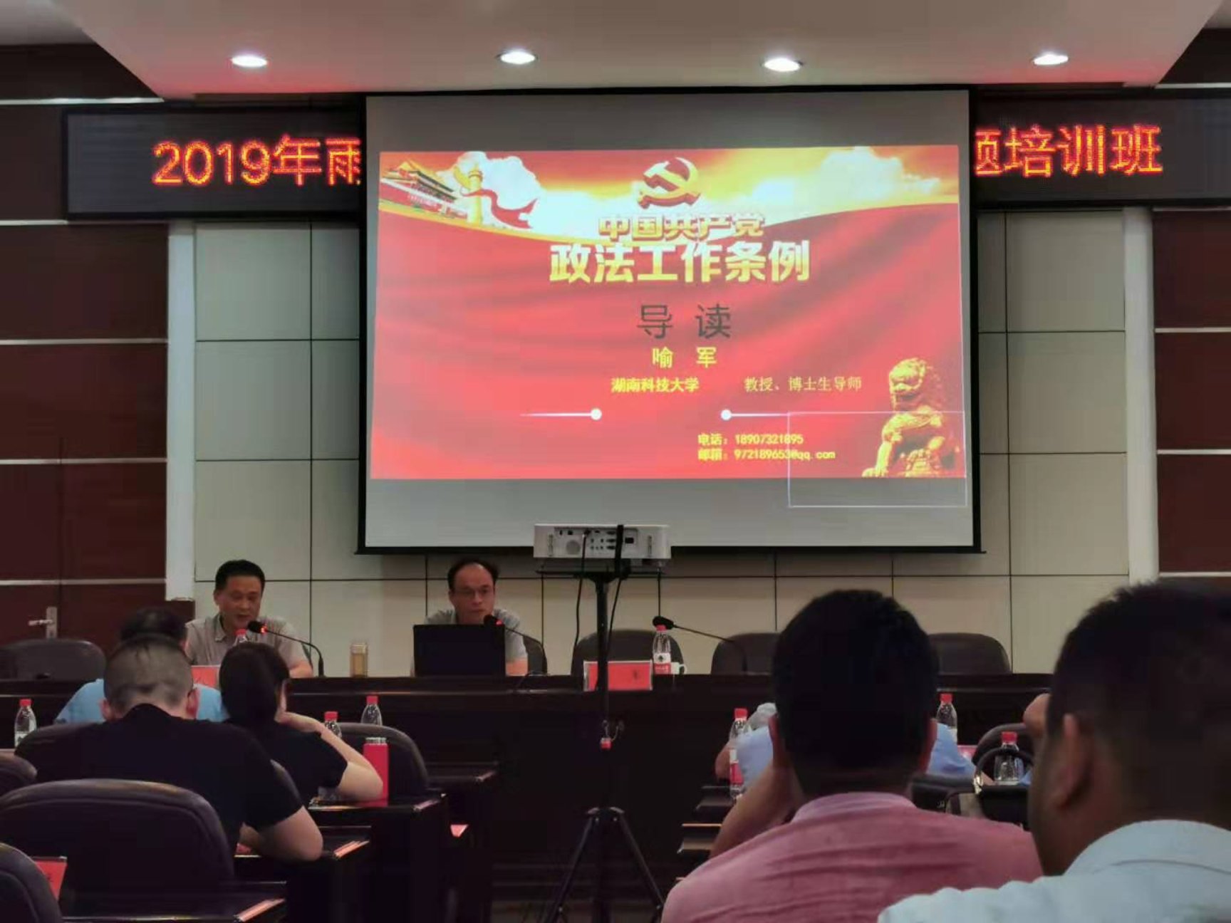2019年9月11日,金牌影院喻军教授应雨湖区政法委之邀,前往雨湖区政法委2019年雨湖区政法系统领导干部专题培训班进行授课。
