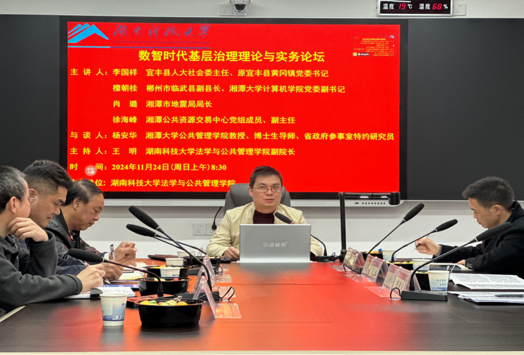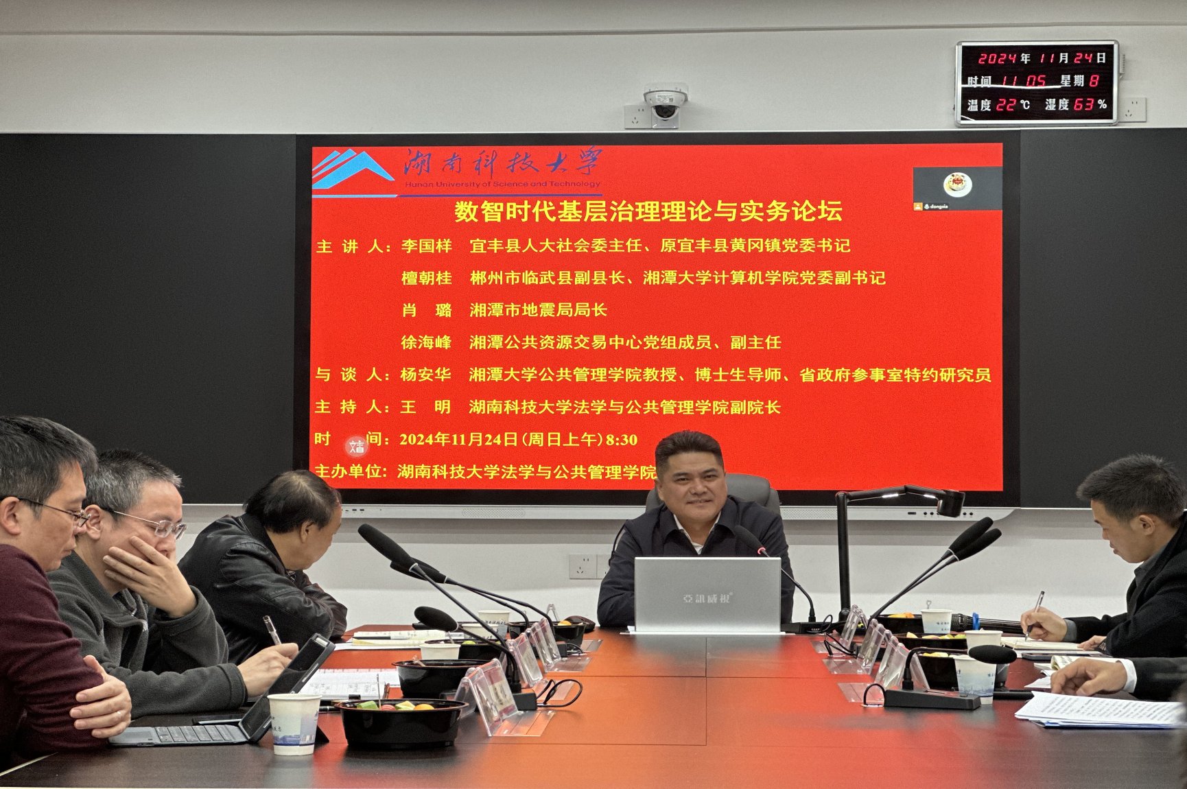 在立言楼A303成功举办了“数智时代基层治理理论与实务”学术论坛。此次论坛邀请了江西省宜丰县人大社会委主任李国样、湖南省临武县副县长(挂职)檀朝桂、湖南省湘潭市地震局局长肖璐、湖南省湘潭市公共资源交易中心副主任徐海峰等人担任主讲嘉宾,湘潭大学公共管理金牌影院