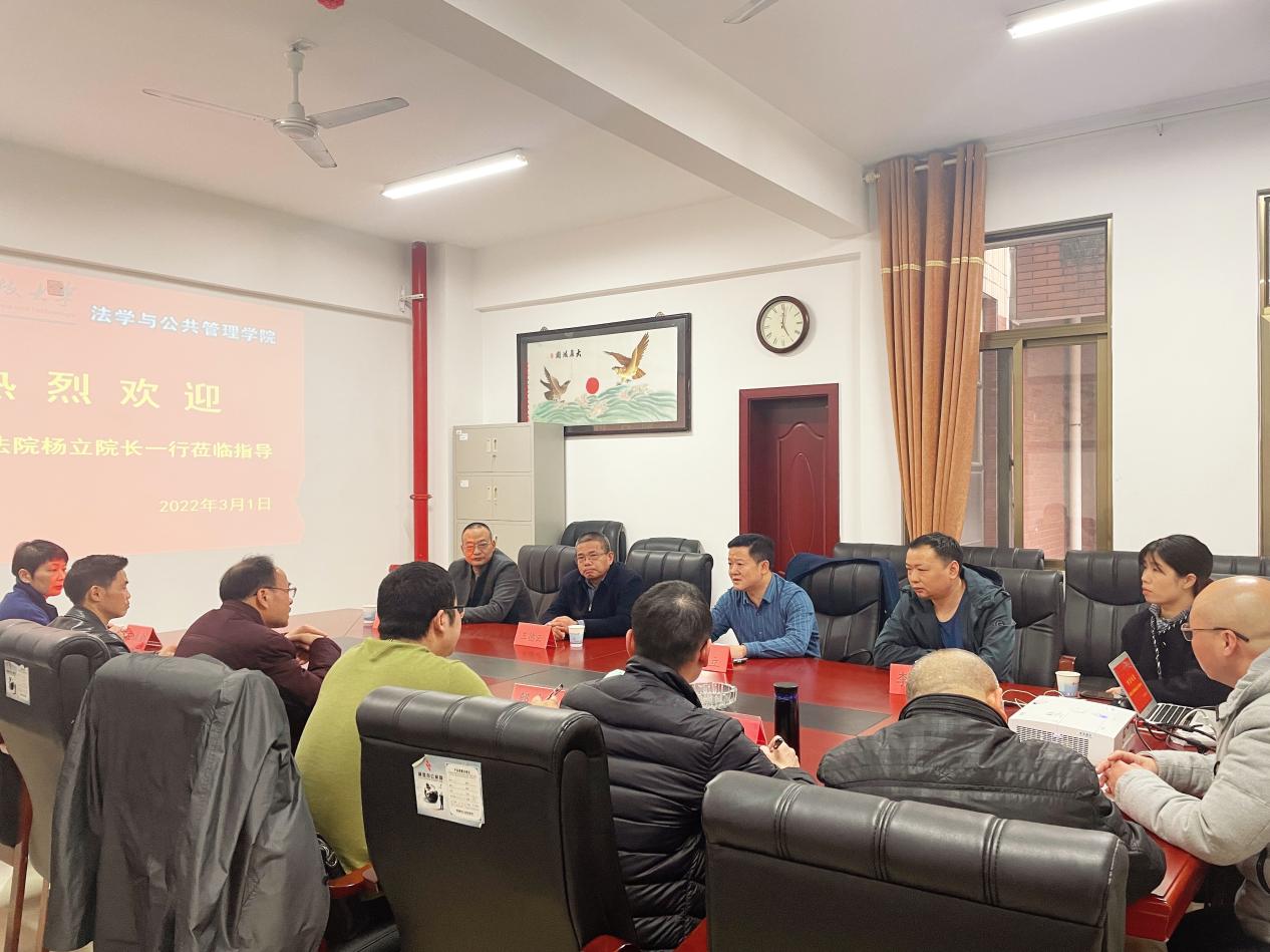 首先,邱帅萍书记在开场致词中感谢了雨湖区人民法院对金牌影院老师、学生实务工作的支持和帮助,并表达了对杨院长一行到来的热烈欢迎。随后,杨立院长一行与金牌影院领导、老师就在校学生专业实习项目合作进行重点交流,并就法治人才的培养、实习基地建设、案例研究、公益活动等进行了深一步探讨。
