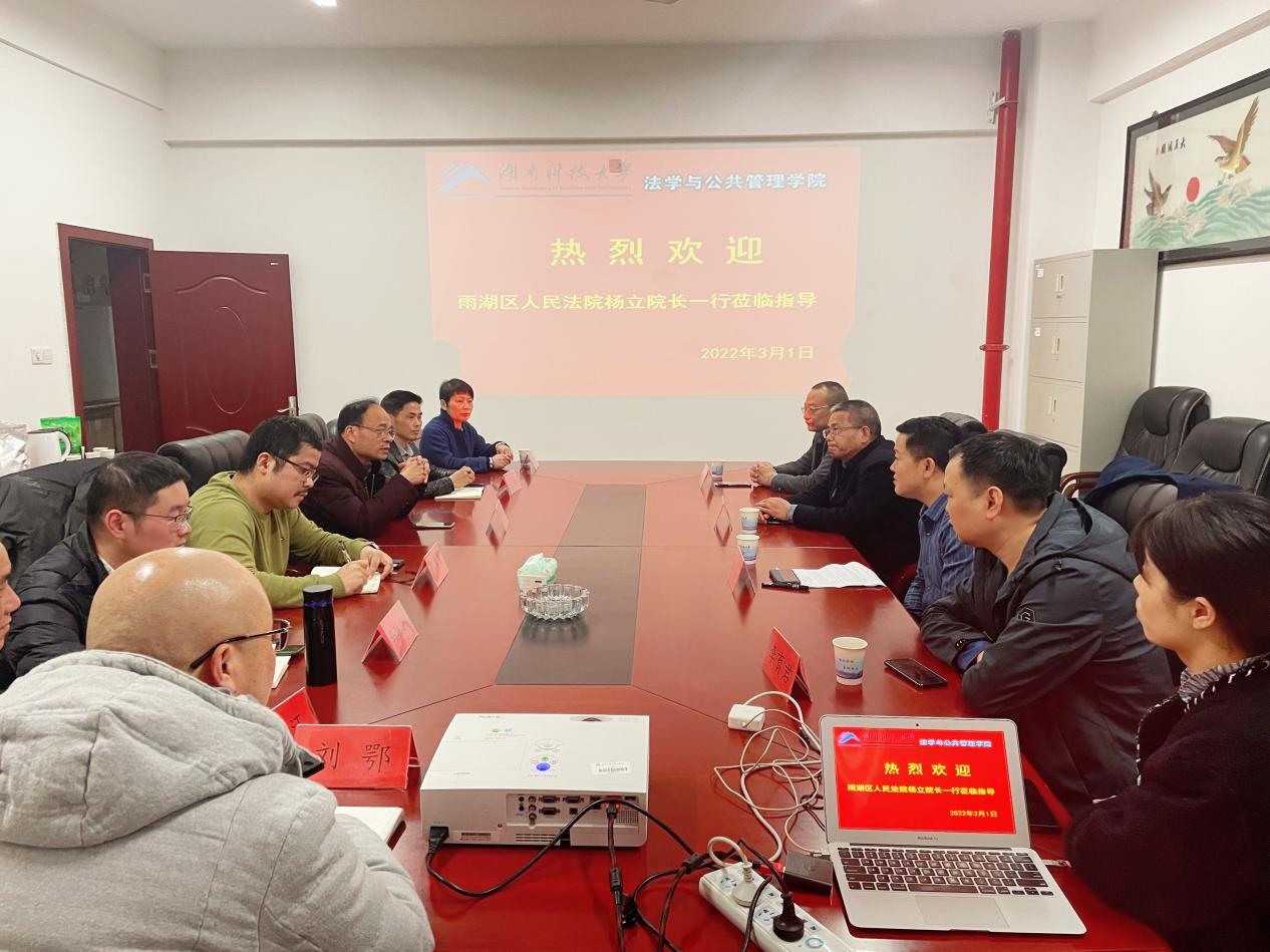 多年来,金牌影院与湘潭市雨湖区人民法院的合作在大学生诉讼引导志愿活动、庭审进校园等方面取得了较大成功。为进一步深化院校合作,加强双方联系,2022年3月1日下午,雨湖区人民法院党组书记、院长杨立,副院长王德云,政治部主任方刚,执行局局长李育君,民二庭庭长暨立春等莅临金牌影院指导交流。金牌影院党委书记邱帅萍主持了会议,副院长王明、法律服务中心主任马驰升、喻军教授、法律系主任吴四江、法律硕士点负责人刘鄂、实践教学中心主任左洪剑等参加了交流会。